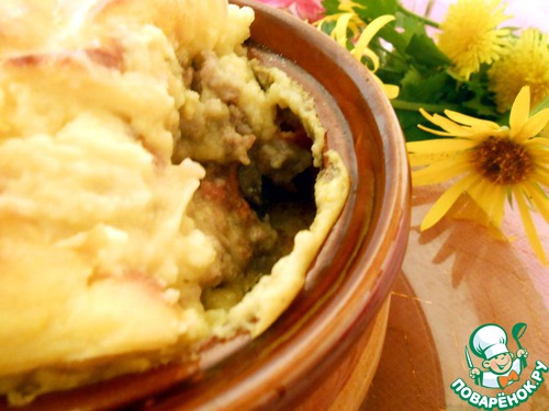 5-ый слой - картофельное пюре. Выкладываем горкой, полностью закрывая горлышко горшочка.
