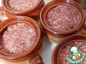 4-ый слой: мясной фарш. Также уплотняем, выравниваем.