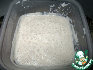 В глубокой емкости развести дрожжи кислым молоком, добавить 1 ст. л. сахара. Когда дрожжи разойдутся, добавить муку, размешать до однородности, закрыть крышкой и отправить в холодильник на 12 и более часов. Так выглядит тесто через 12 часов.