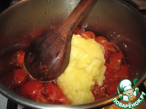 Добавить пюре к помидорам. Влить уксус. Поварить 5 минут.