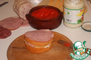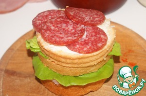 Намазать соусом и поместить ветчину, накрыть ее листиком салата...