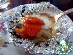 Дальше выложить мытые и нарезанные абрикосы, можно и половинками, но так вкуснее)) Приподнимаем фольгу немного по бокам, и выдавливаем из лимона примерно по 1 ст. л сока на порцию. после добавляем масло (1 ч. л на порцию), даем постоять около получаса, пока жарятся основные яства.)