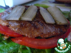 Тонко нарезать соленый огурец, помидор. Можно складывать из ингредиентов гамбургер. На одну часть хлеба укладываем лист салата, сверху ломтик (и) помидора.