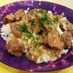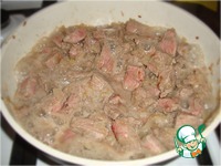 Порезать говядину (≈ 4 см.) и обжарить вместе с луком.