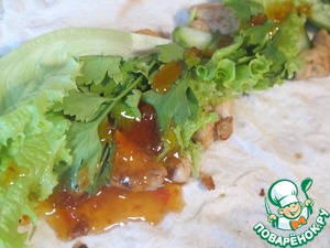 На лаваш выложить: зеленый лучок, кусочки мяса, нарезанный огурец, листья салата и полить соусом Blue Dradon сладкий чили.