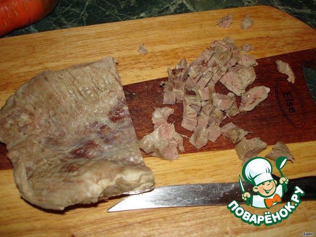 • Вареное мясо порезать кубиками.