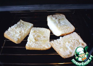 Чиабатту разрезаем, сбрызгиваем оливковым маслом, отправляем под гриль на 3-4 минуты до золотистой корочки.