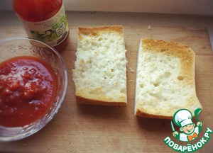 На хлеб выкладываем томатный соус, сбрызгиваем соусом чили по 6-7 капель на один кусочек