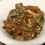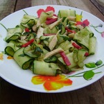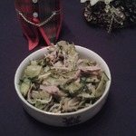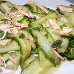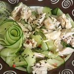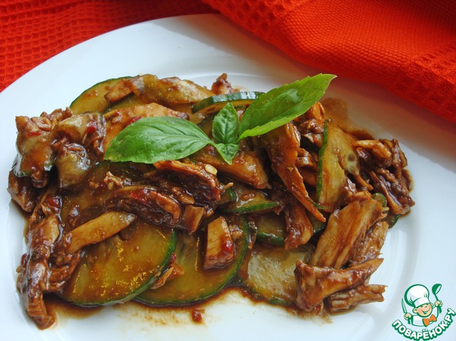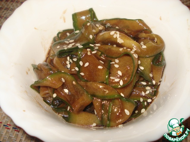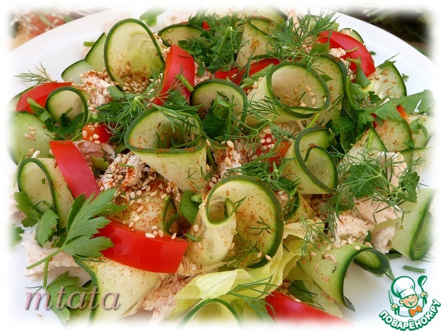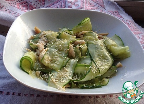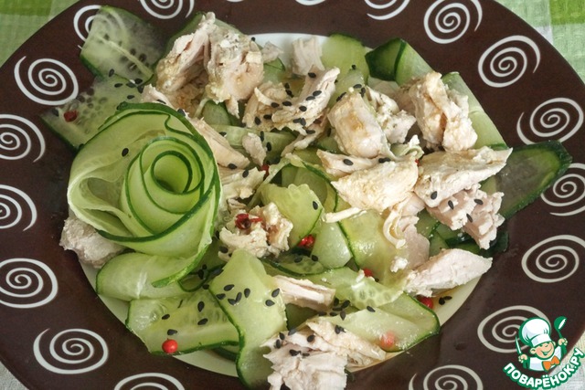 Вареное мясо разобрать на волокна, перемешать с огурцами, влить заправку. Добавить кунжут.