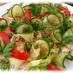[+4]Теперь о вкусе. Очень интересно получается, неизбито. И, как мне кажется, вкус даёт именно такая нарезка огурцов. Вновь прошу прощения за внешний вид салатницы, в этот раз Ляля кунжутом посыпала, пальчиками залезла и вновь не давала навести красоту)))