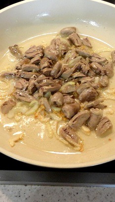 Лук нарезать полукольцами и обжарить до румяного цвета, добавить сердечки и обжарить 1 минуту.
