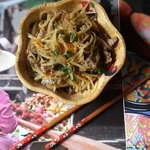 Катрофель очистить и с помощью корейской терки или бернеровской, или острым ножом нарезать на тонкую длинную соломку и отварить 3 минуты в кипящей воде. Отбросить на дуршлаг и промыть холодной водой. Обсушить.
