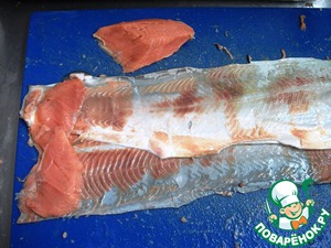 Филе горбуши аккуратно срезать пластами со шкуры. Шкурка желательно должна остаться неповрежденной. -