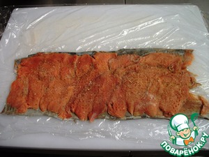Нарезанное пластинками филе горбуши разложить на шкурке, посыпать специями, посолить.