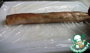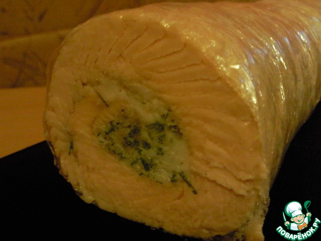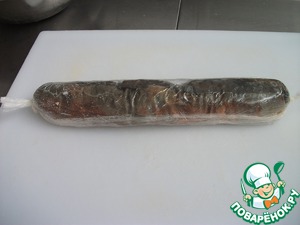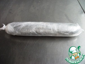 Концы пленки завязать узлом. Опустить в кипящую воду и варить примерно 20 минут. Вынув, остудить и на ночь убрать в холодильник.