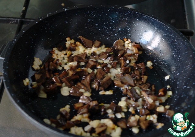 Добавляю грибы, обжариваю 2-3 минуты и оставляю остужаться.