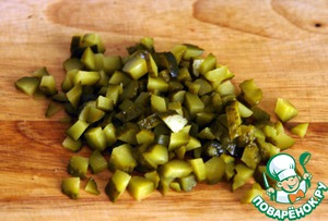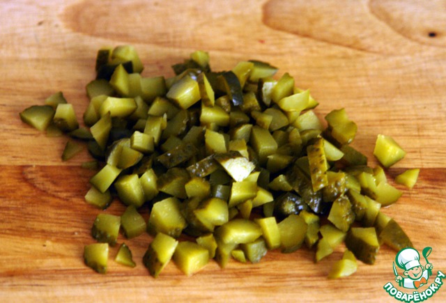 Корнишоны нарезаем кубиками не более 0,5 см.