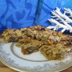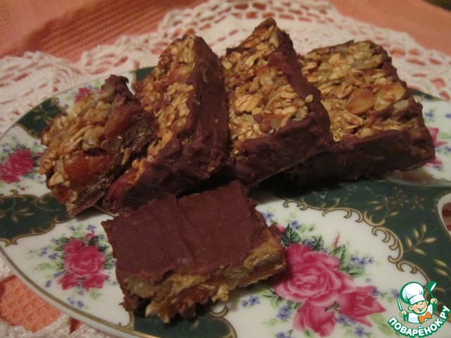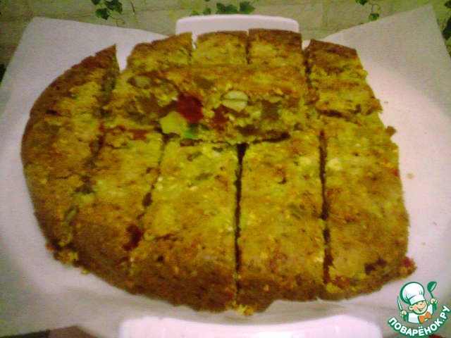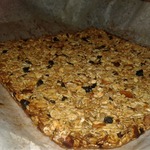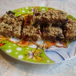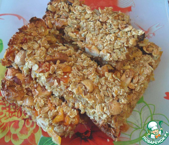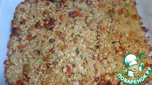 [+4]мед добавила в яйцо, а потом все смешала. Форма у меня прямоугольная, больше, чем указано в рецепте, поэтому заполняла ее не всю, придавливала лопаткой хорошенечко так - потому что масса была такой консистенции, что не верилось, что сразу не рассыпется. к краю приставила доску, чтобы держала. Зря я волновалась. пробовала сразу после духовки. похоже на мюсли. Чем больше сухофруктов, тем вкуснее, так мне показалось. я добавила изюм, чернослив, финики, курагу, семечки подсолнечника, фундук, арахис, миндаль.