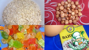Нужно взять 150 гр. овсяных хлопьев, 50 гр. любых орехов, 100гр. любых сухофруктов (у меня был изюм и цукаты), 1ст. л. мёда, пачка ванильного сахара, 1 яйцо куриное и апельсин.
