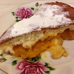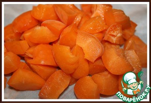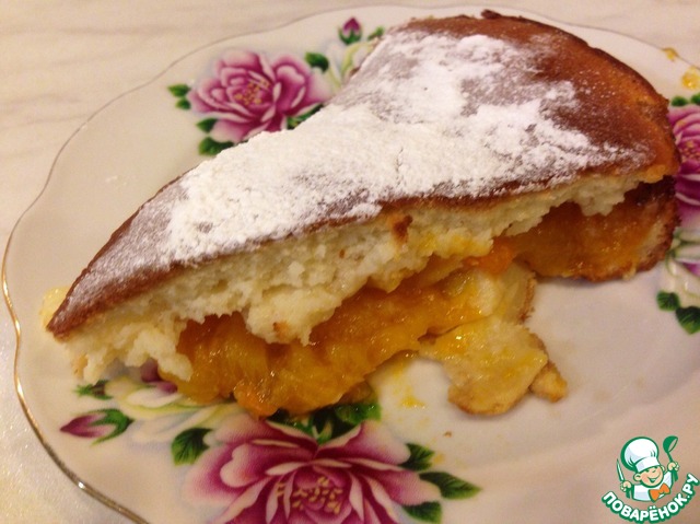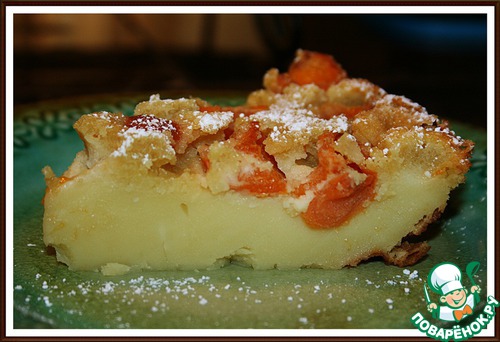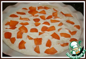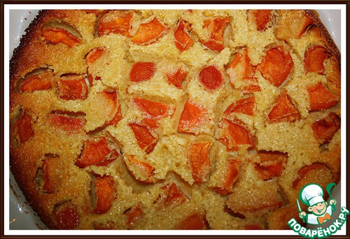6. Форму (д=25 см) смазать маслом и посыпать сахаром. Влить тесто, сверху кусочки абрикоса.