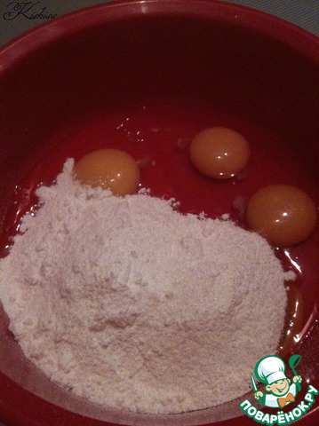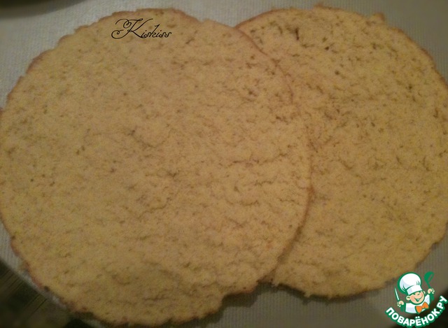 Все это дело ставим в разогретую до 200 градусов духовку. Выпекаем. Даем остыть. Разрезаем на 2 равные части. Пропитываем каждый корж.