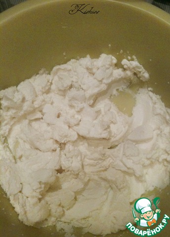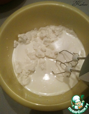 К творожной массе добавляем сливки. Медленно взбивая миксером, всыпаем сахарную пудру. Продолжаем взбивать до однородности.