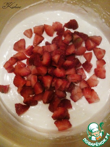 Сюда же всыпаем нарезанную кубиками клубнику и перемешиваем.