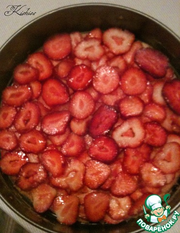 В разъемную форму выкладываем первый корж. Сверху на корж отправляем нарезанную дольками клубнику.