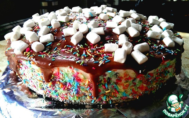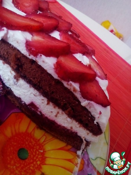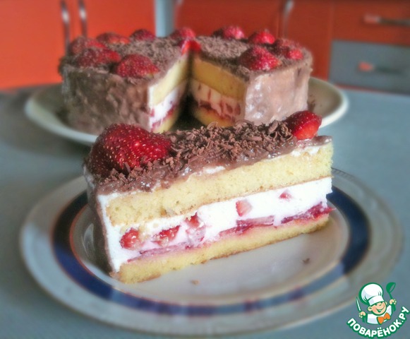 Только бисквит здесь лимонный, вместо клубники - консервированные ананасы, а сверху шоколадная крошка и тертый шоколад.