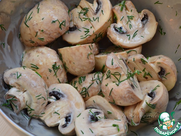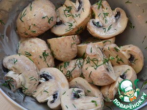 Положить туда шампиньоны, хорошо перемешать и оставить мариноваться на час, иногда перемешивая. -