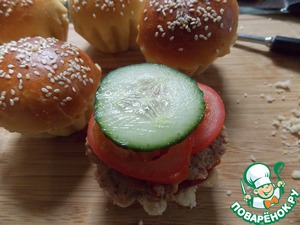 • Листик салата, и накрываем все сверху верхушкой булочки. Теоретически, для усиления конструкции можно все слои скрепить деревянной шпажкой.