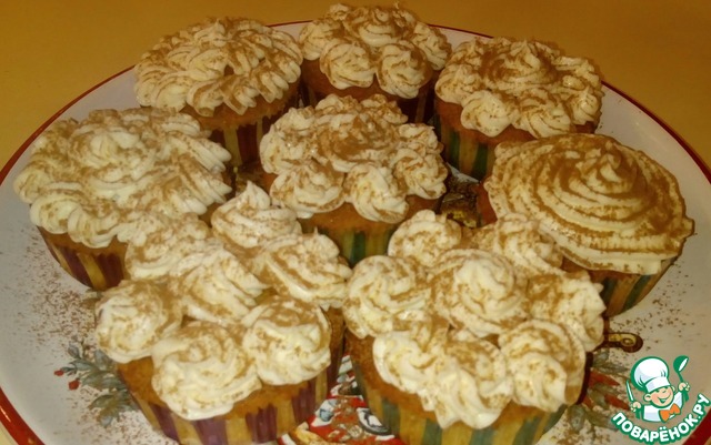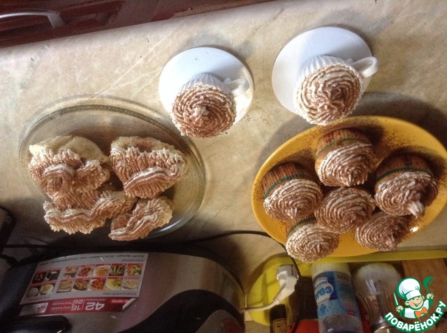 Перекладываем в кондитерский мешок (у меня была самая банальная насадка с круглой дырочкой) и украшаем капкейки. Сверху присыпаем какао-порошком через ситечко.