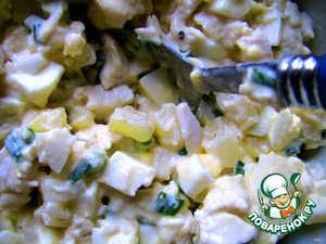 Всё немного посолить, слегка поперчить, добавить майонез и перемешать.