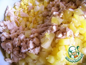 Отварную куриную грудку, яйца и ананасы порезать кубиками и выложить в салатник.