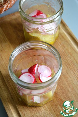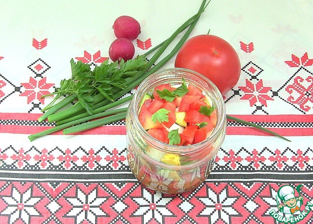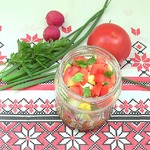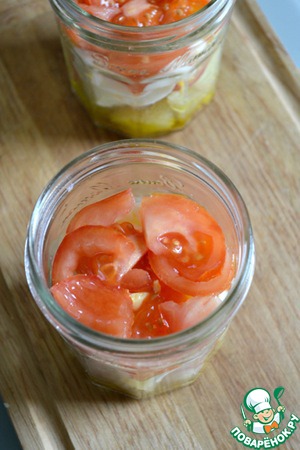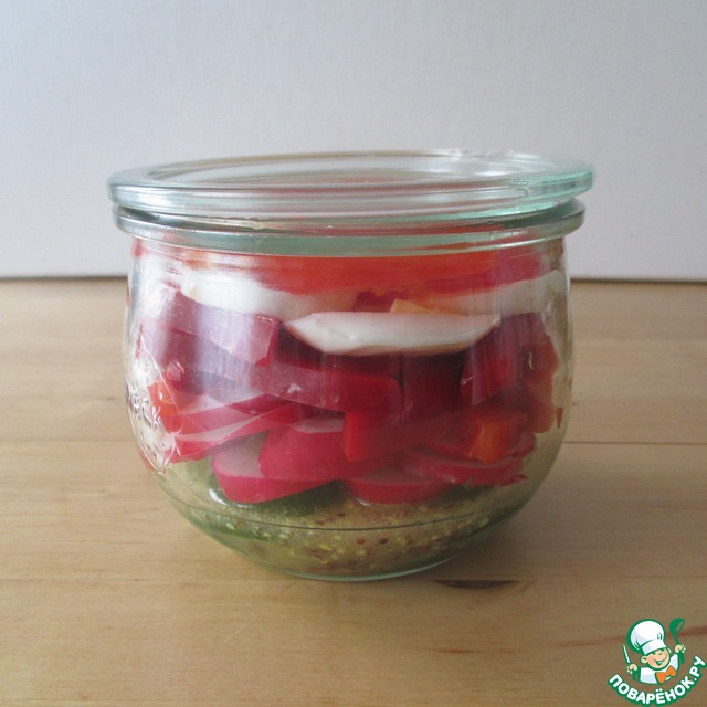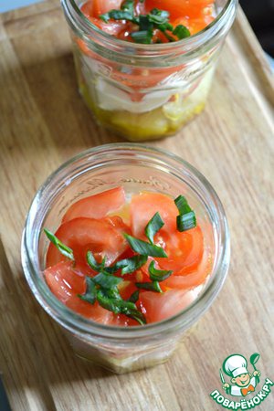 Складывать овощи следует по принципу "от твердого к мягкому". То есть в низ баночки кладются твердые и тяжелые ингредиенты, а сверху - самые легкие. Таким образом наши овощи не помнутся от тяжести. -