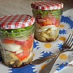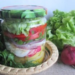 И заключительный слой - листовой салат доверху. Накрыть банку крышкой и хранить до подачи в холодильнике или же повезти салат на природу, чтобы насладиться летним солнышком!