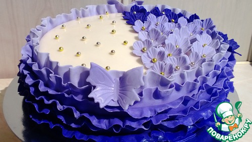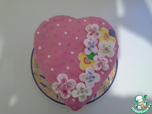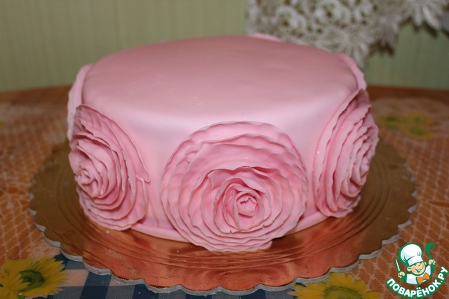 Перед тем, как нанести рюши, смазываем мастику раствором: водичка + мед.
