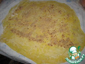 Расстелите на столе большое кухонное полотенце (я взяла тонкую детскую пеленку). Присыпьте его мукой. На полотенце раскатайте как можно тоньше тесто в прямоугольный пласт. Смажьте его растопленным сливочным маслом (используем не все масло, примерно половину)