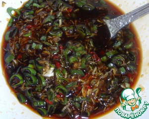 Лук мелко нарезать, сложить в чашку, перец и чеснок тоже измельчить и добавить к луку. Влить соевый соус и мёд. Имбирь натереть на мелкой тёрке. У вас должна получиться довольно-таки густая кашица.
