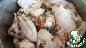 Обмазать все крылышки этой смесью и оставить мариноваться на 24 часа. После этого разложите крылышки под грилем, или на гриле или барбекю, и поджаривайте до румяной корочки.
