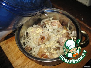Выложить обжаренные куски курицы, пересыпая луком и чесноком