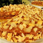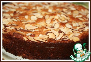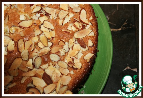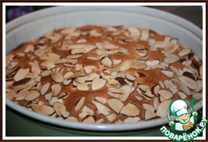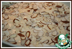 6. Форму (д=18 см) смазать маслом и застелить бумагой. Влить тесто и посыпать лепестками миндаля.