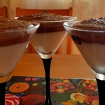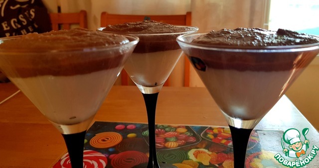 Разлила в стеклянные емкости на половину и поставила в морозилку быстренько слегка застыть (маленькую часть белого пудинга налила в шприц для украшения). В это время в оставшуюся массу пудинга добавила какао и опять взбила в блендере. Из морозилки достала слегка застывший пудинг и на него вылила пудинг с какао. Получилось очень красиво, а через стекло видно эти два слоя (белый и коричневый)