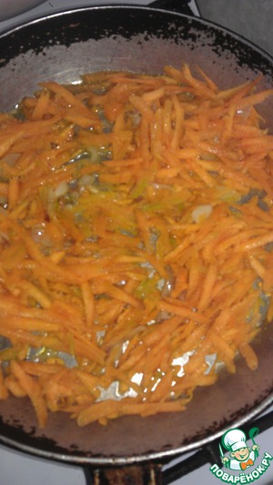 Морковь и лук спассеровать на растительном масле несколько минут-до полупрозрачности лука. Бросить в бульон к картофелю.