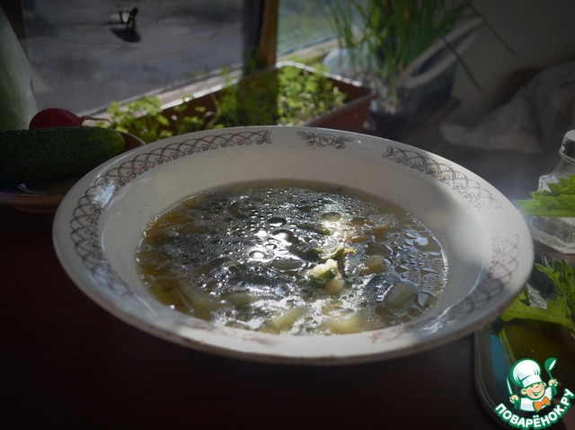 Крапиву бросить в суп, когда картофель уже готов. Добавляем теперь примерно 0,7 л нашего крапивного бульона - смотрите сами - суп должен быть доведен до консистенции, которую вы любите. Поварить еще пару минут. В этот момент проверяем суп на соленость, перчим, бросаем лаврушку, перец по вкусу