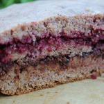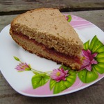 Немного даем бисквиту отдохнуть, приостыть. Разрезаем пополам. Теперь-наступает время для полета вашей фантазии. Я прослоила коржи все тем же клубничным вареньем (иногда делаю настоящие крема, либо выкладываю маринованный фрукты и проч.). Можете использовать пирог-как основу для любых тортов-так очень интересно получается.
