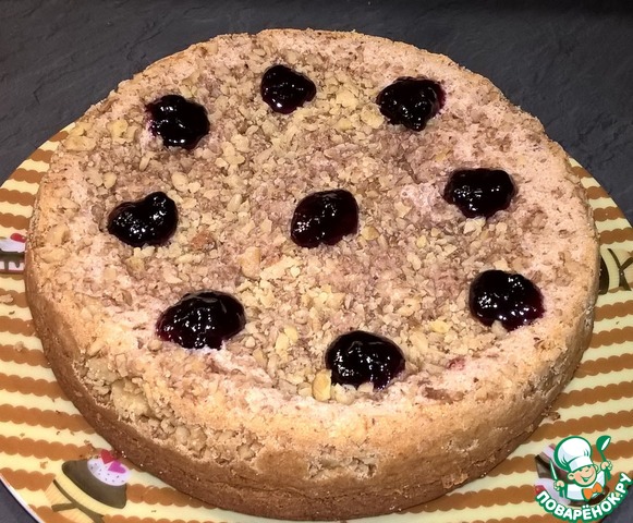 Аккуратно перемешиваем белки с желтками, вводим стакан варенья. Все перемешиваем и добавляем стакан муки, перемешанный с разрыхлителем.