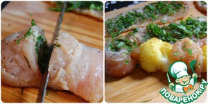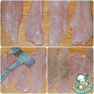 Грудку хорошенько помыть, осушить и нарезать на пластинки. Каждую из них немного отбить, сбрызнуть лимонным соком, посолить и поперчить.
