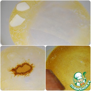 На сковороде разогреть 3 ч. л. растительного масла вместе со сливочным. Всыпать карри.