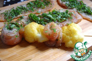 Мясо хорошо посыпать травами, свернуть рулетиком и, чередуя с соцветиями цветной капусты, нанизать на смоченные в воде деревянные палочки для шашлыка.